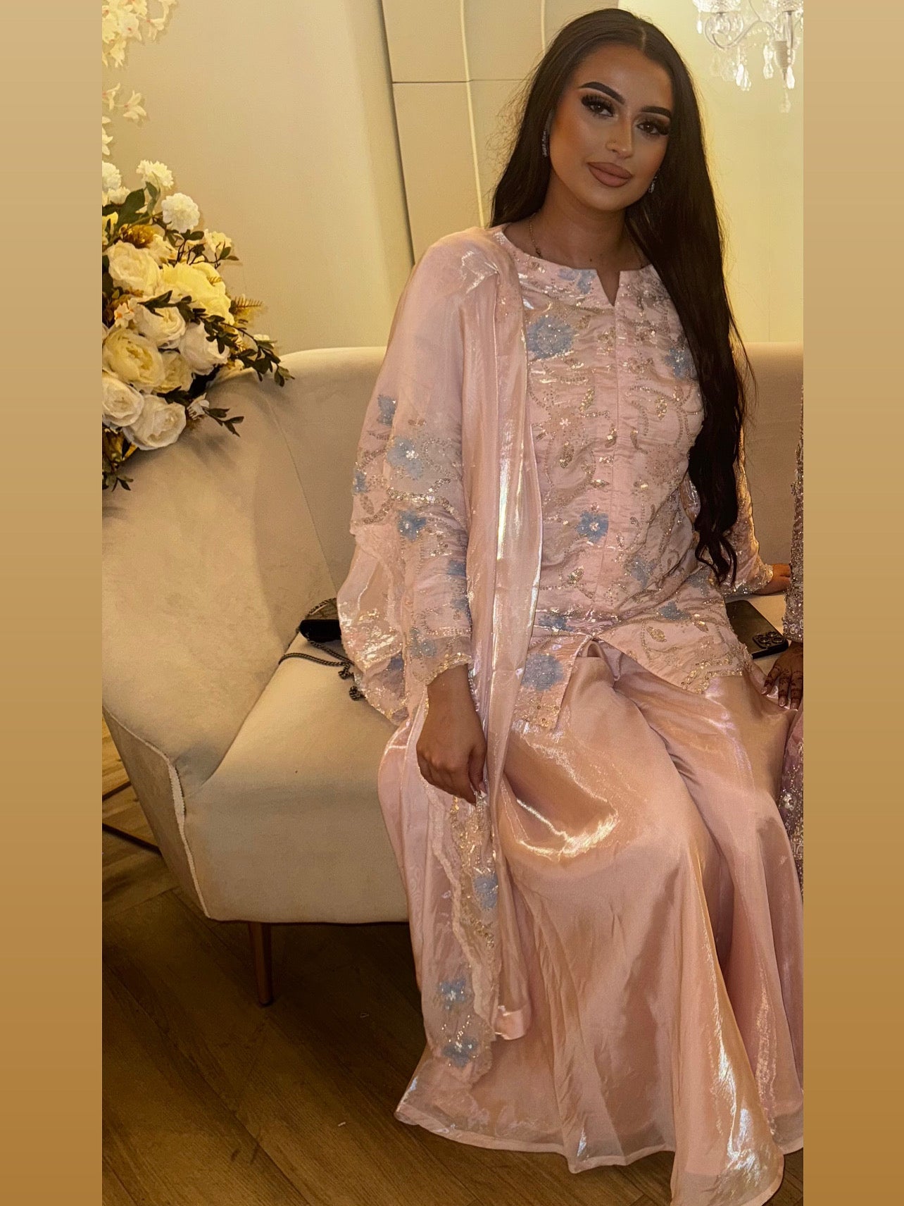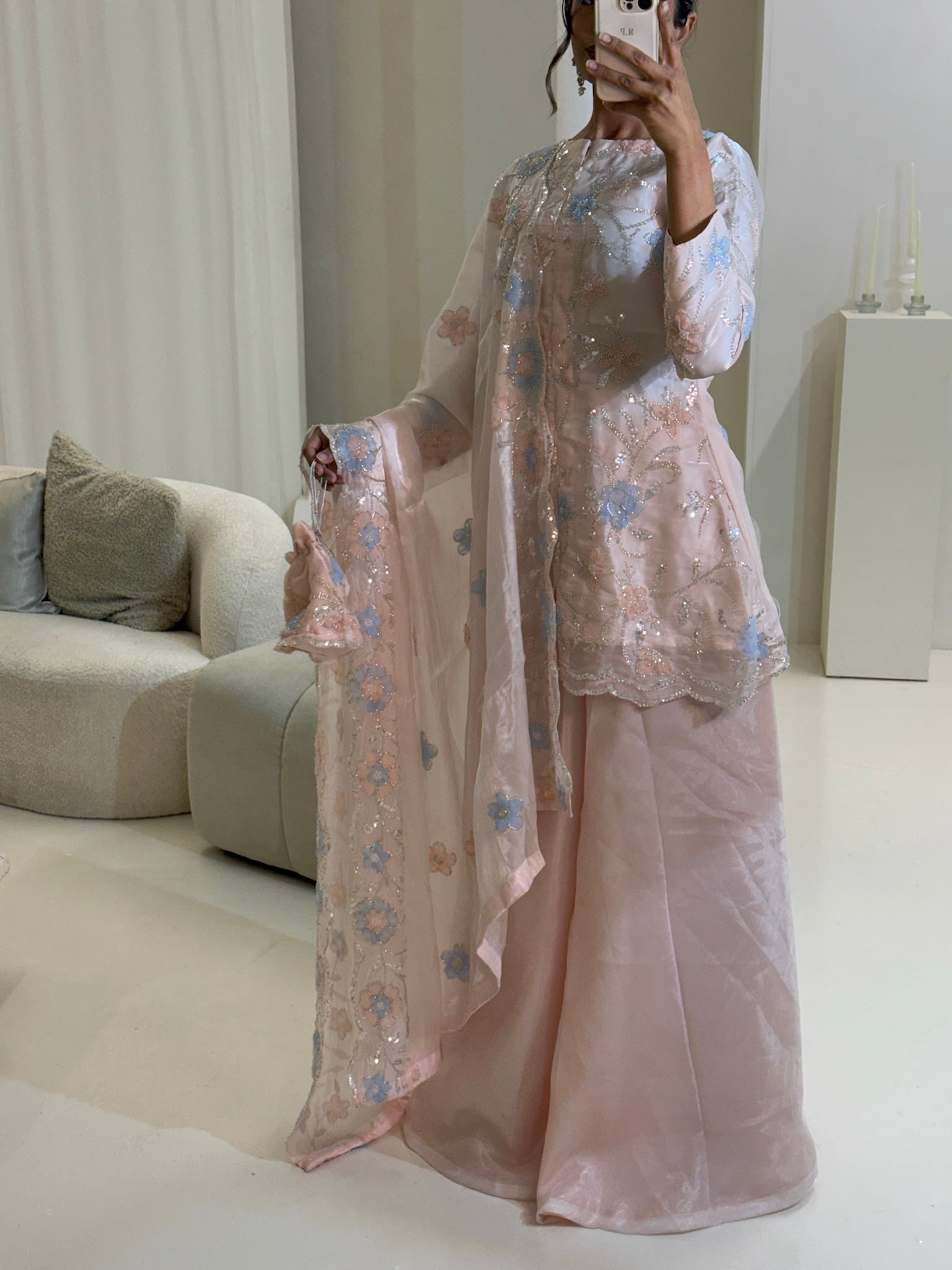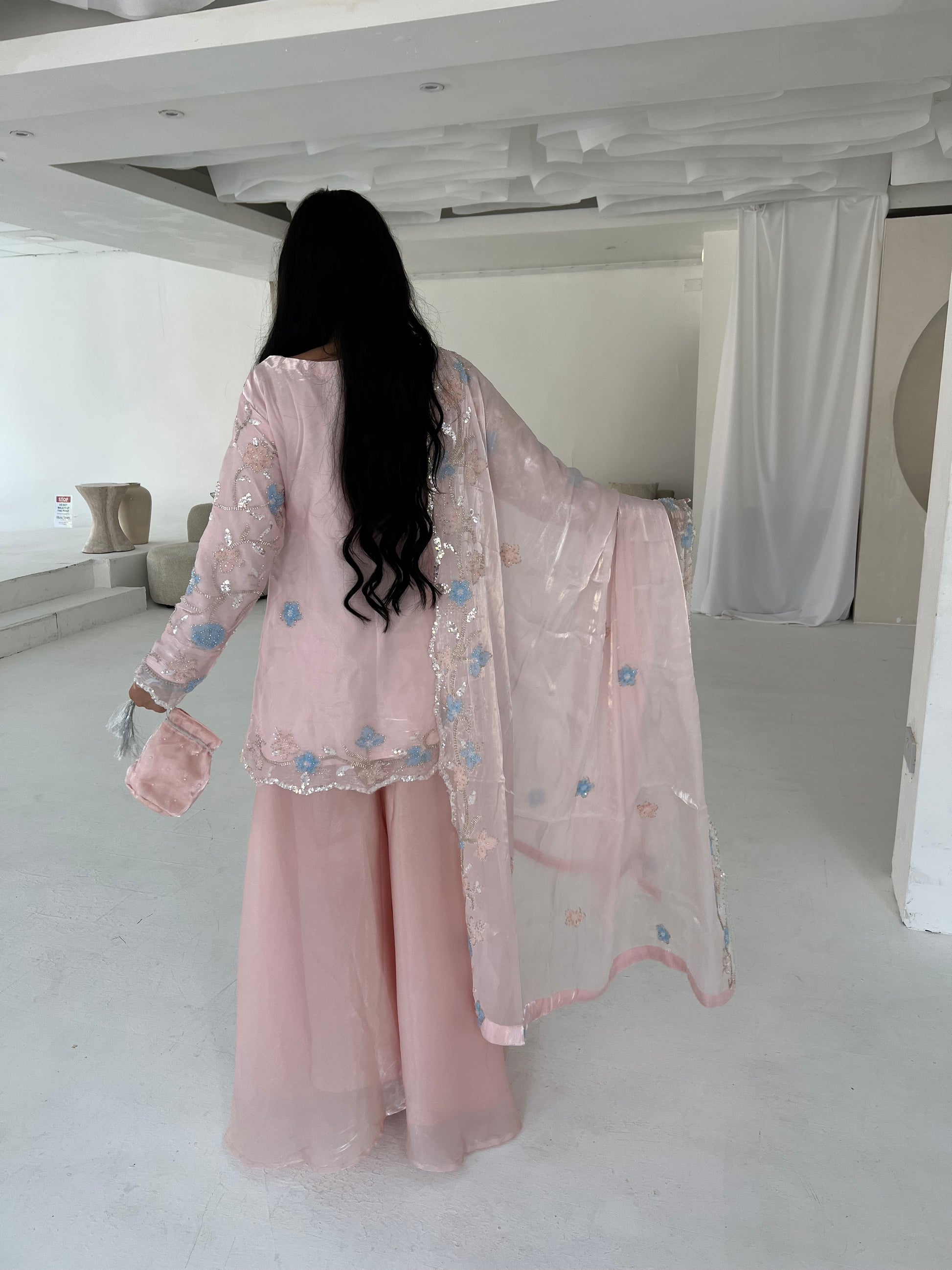 This pastel Pakistani silk suit, adorned with delicate floral detailing comes with a garara, a heavily embellished dupatta, and a matching Potli bag (4pc) perfect for your formal events.