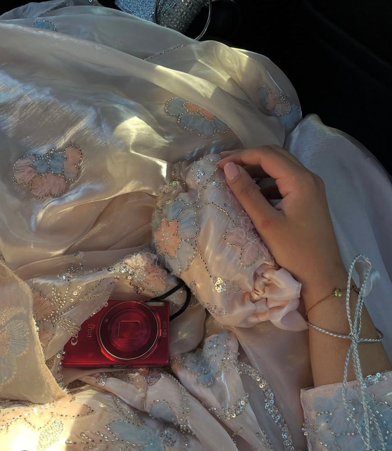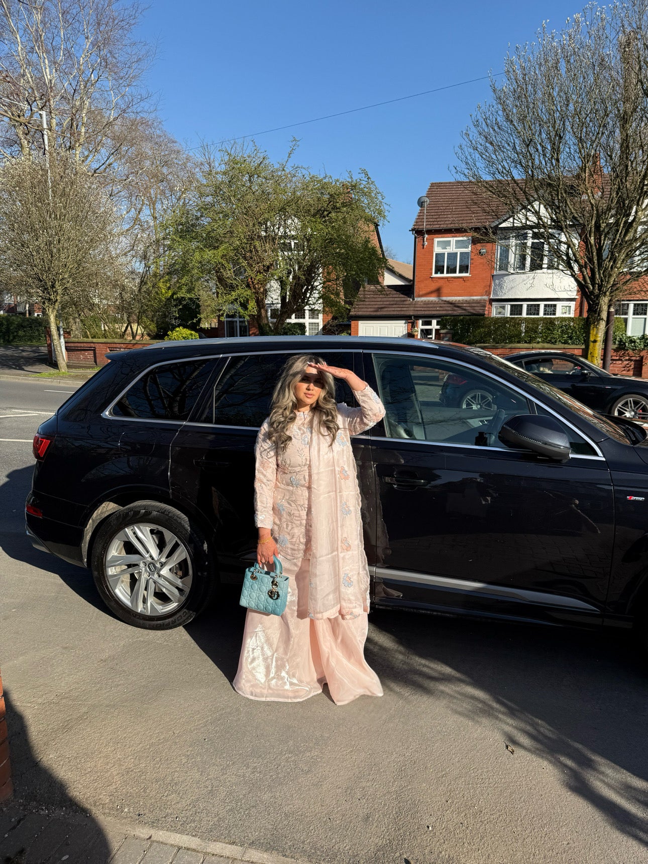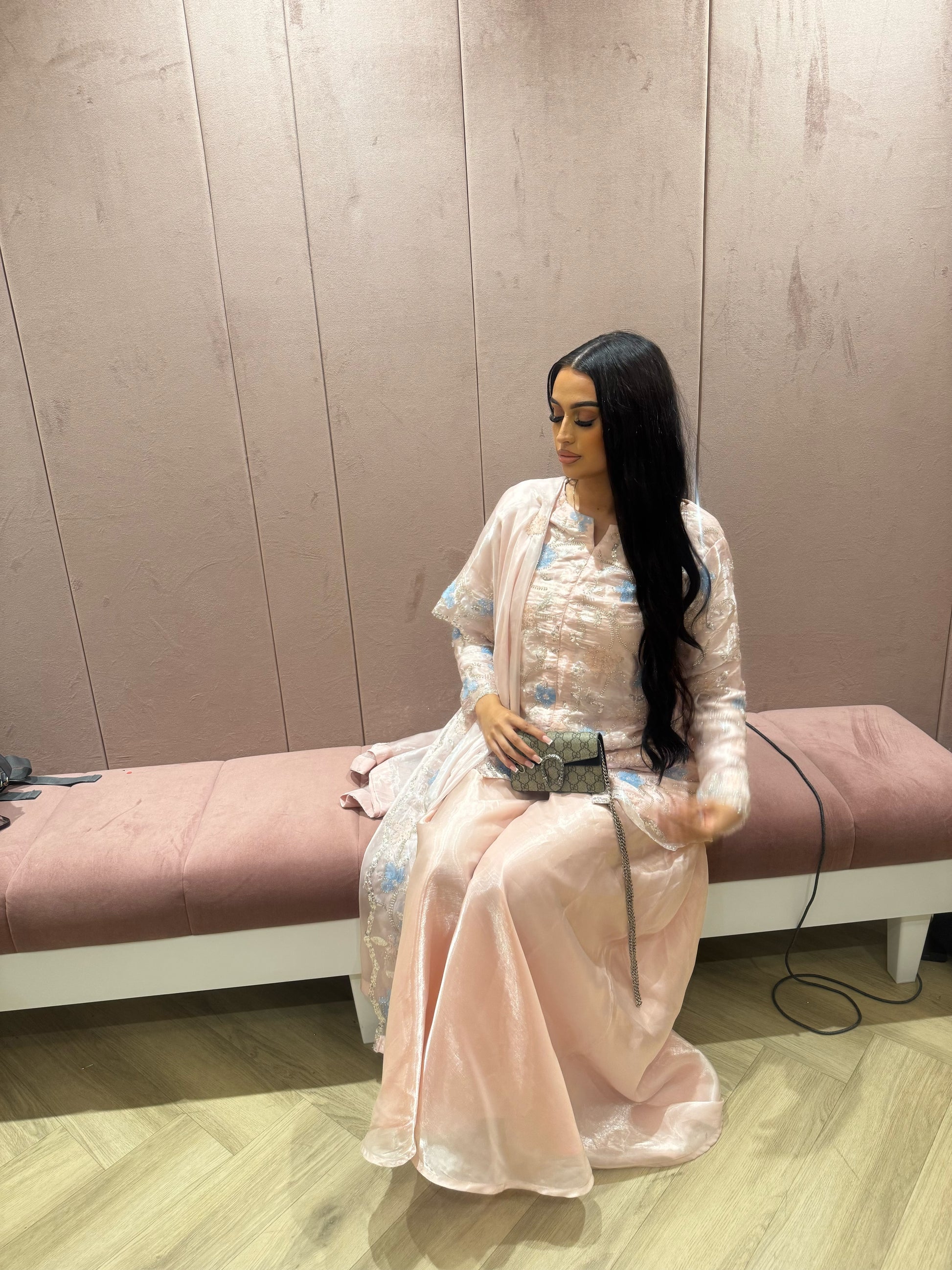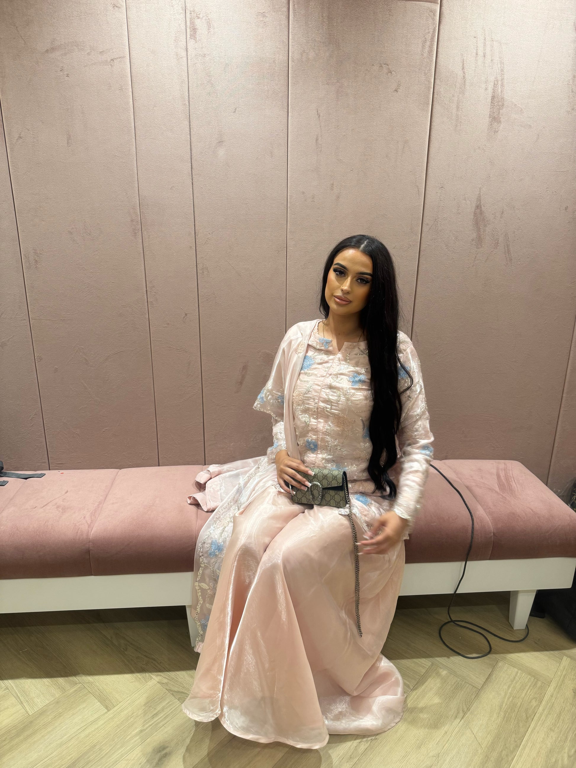 This pastel Pakistani silk suit, adorned with delicate floral detailing comes with a garara, a heavily embellished dupatta, and a matching Potli bag (4pc) perfect for your formal events.