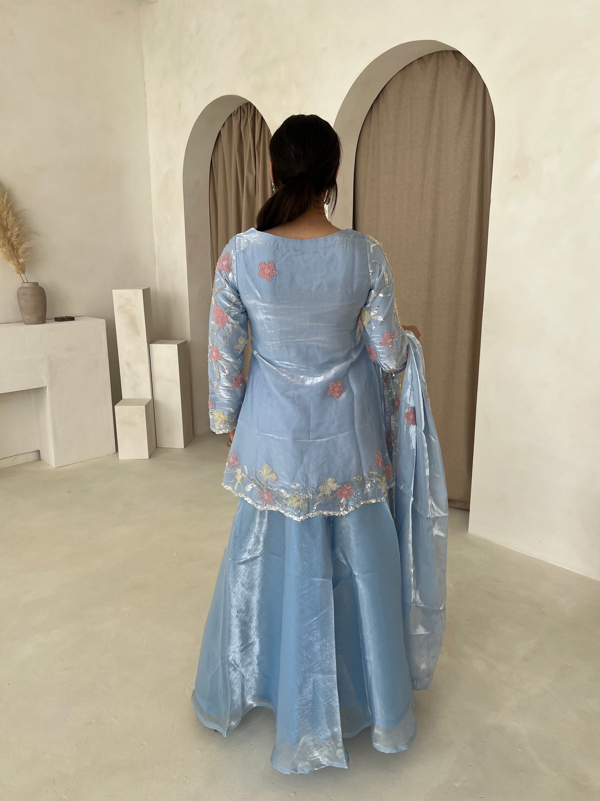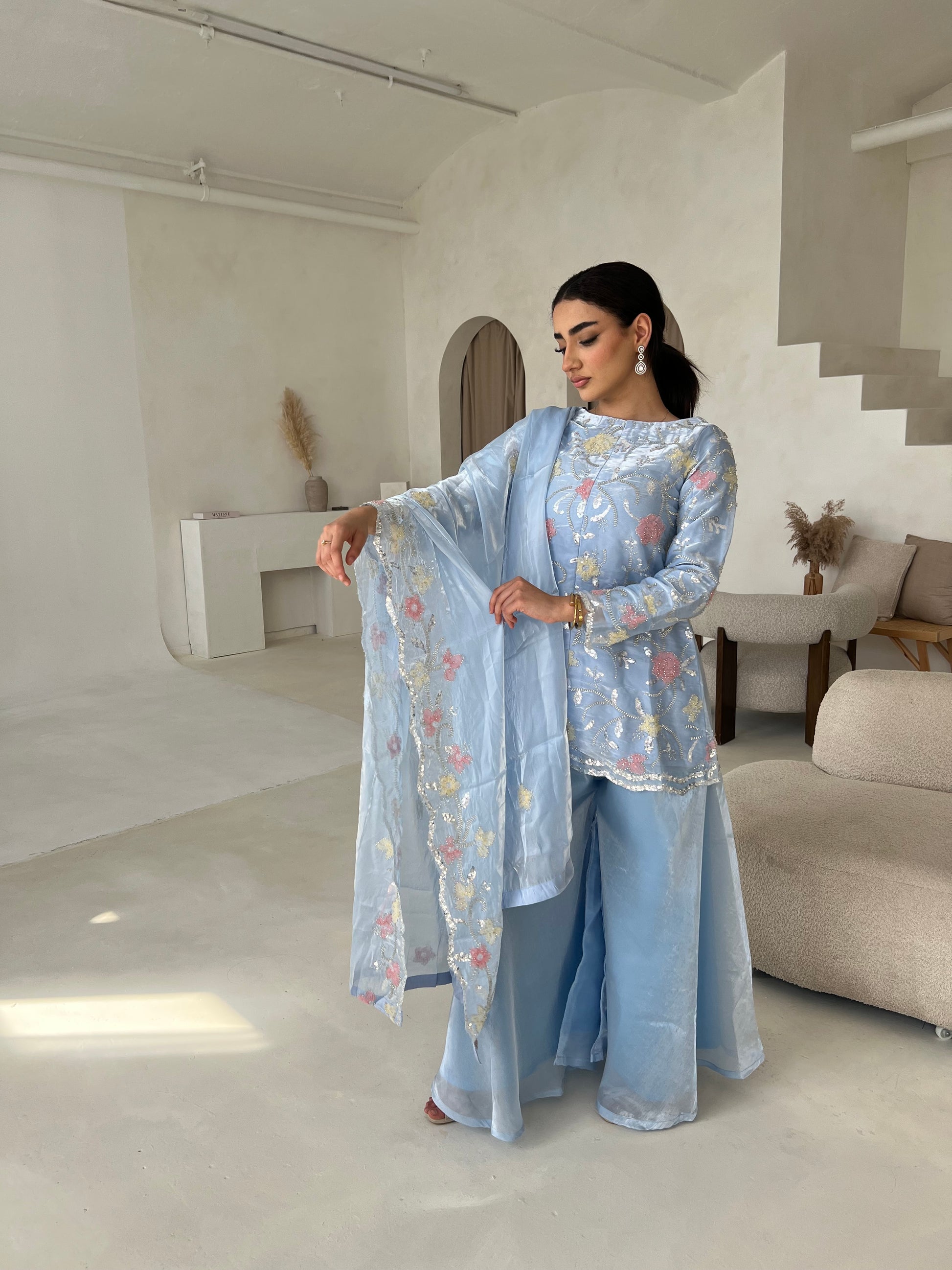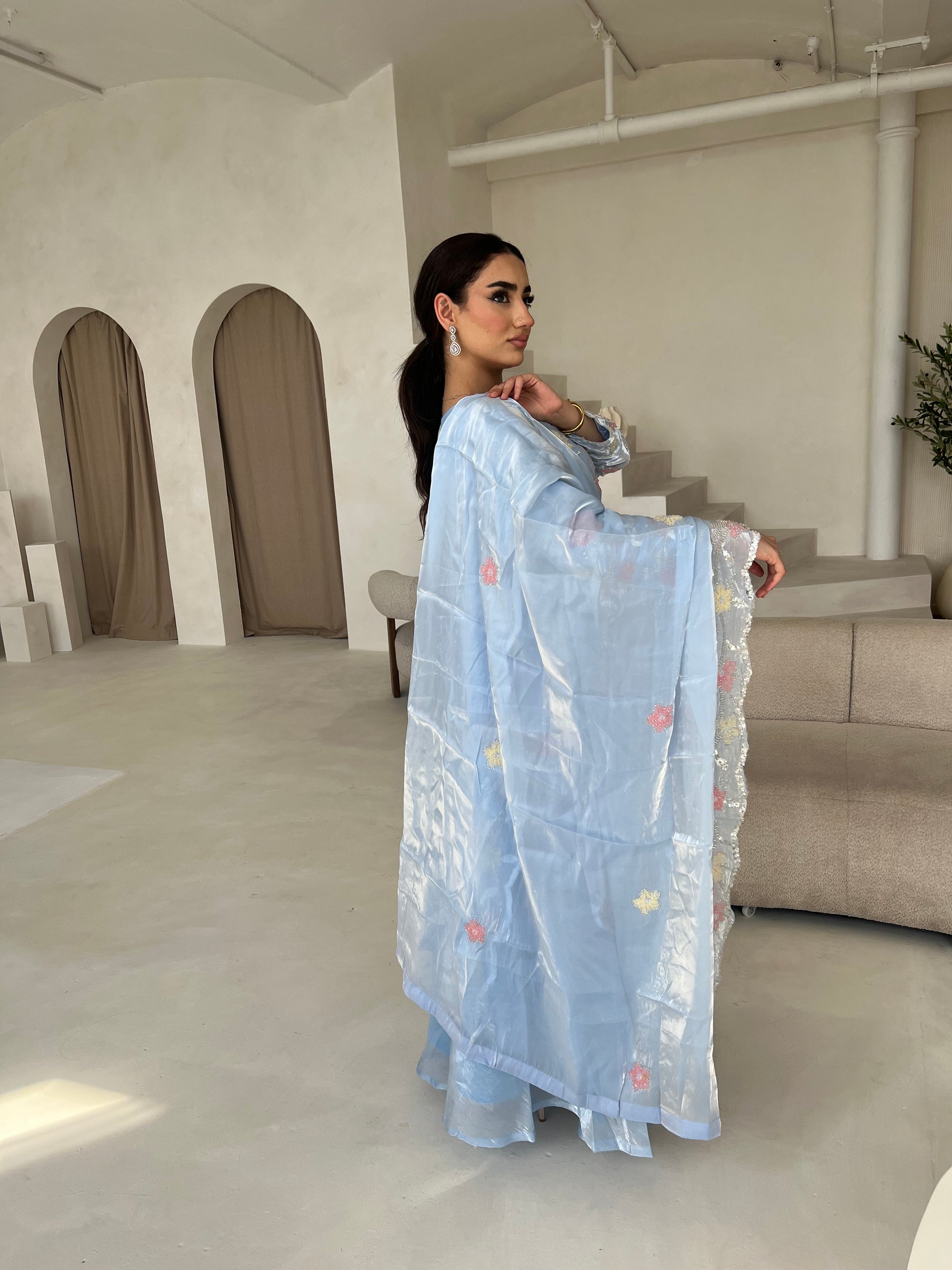This pastel Pakistani silk suit, adorned with delicate floral detailing comes with a garara, a heavily embellished dupatta, and a matching Potli bag (4pc) perfect for your formal events.