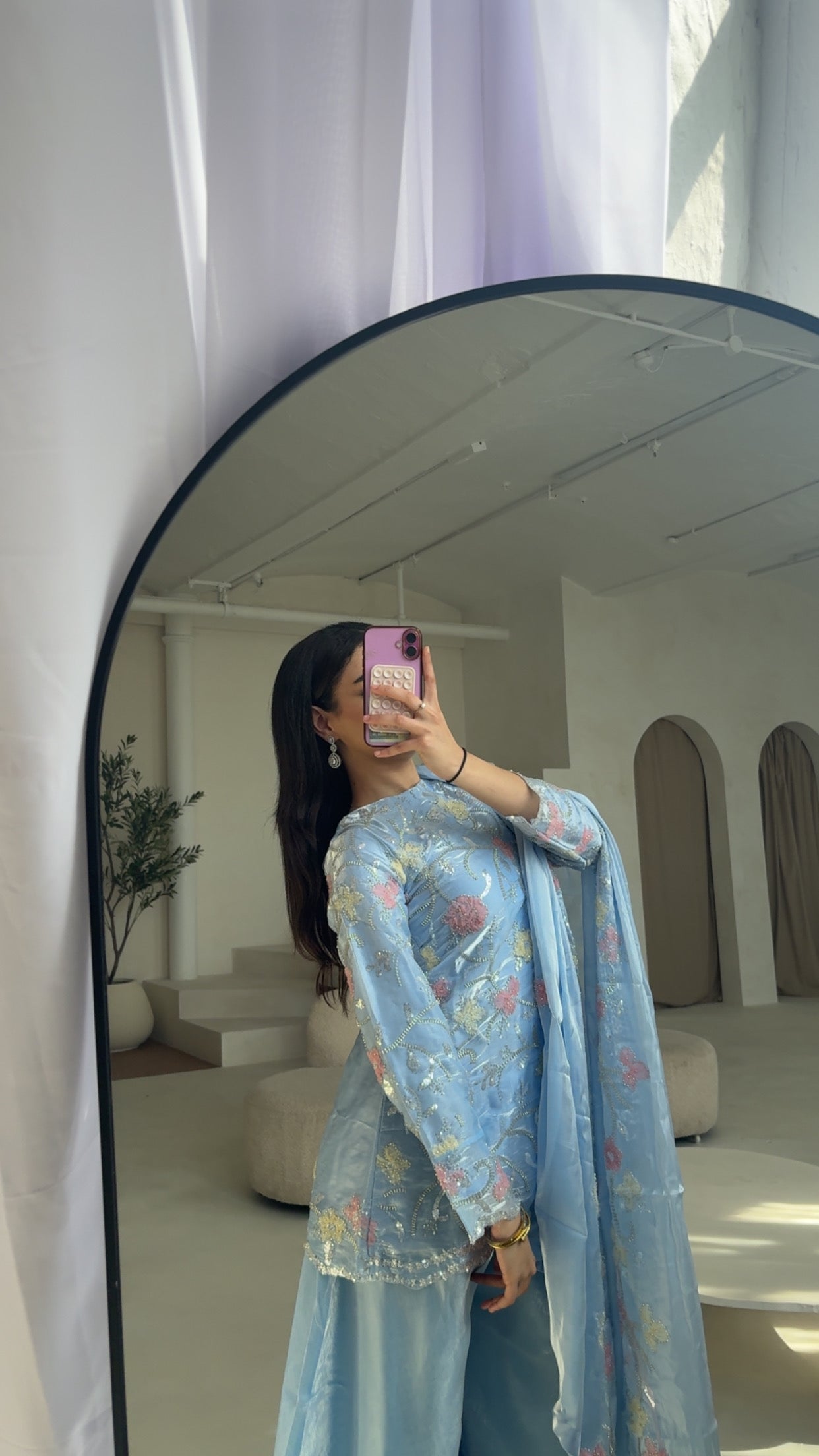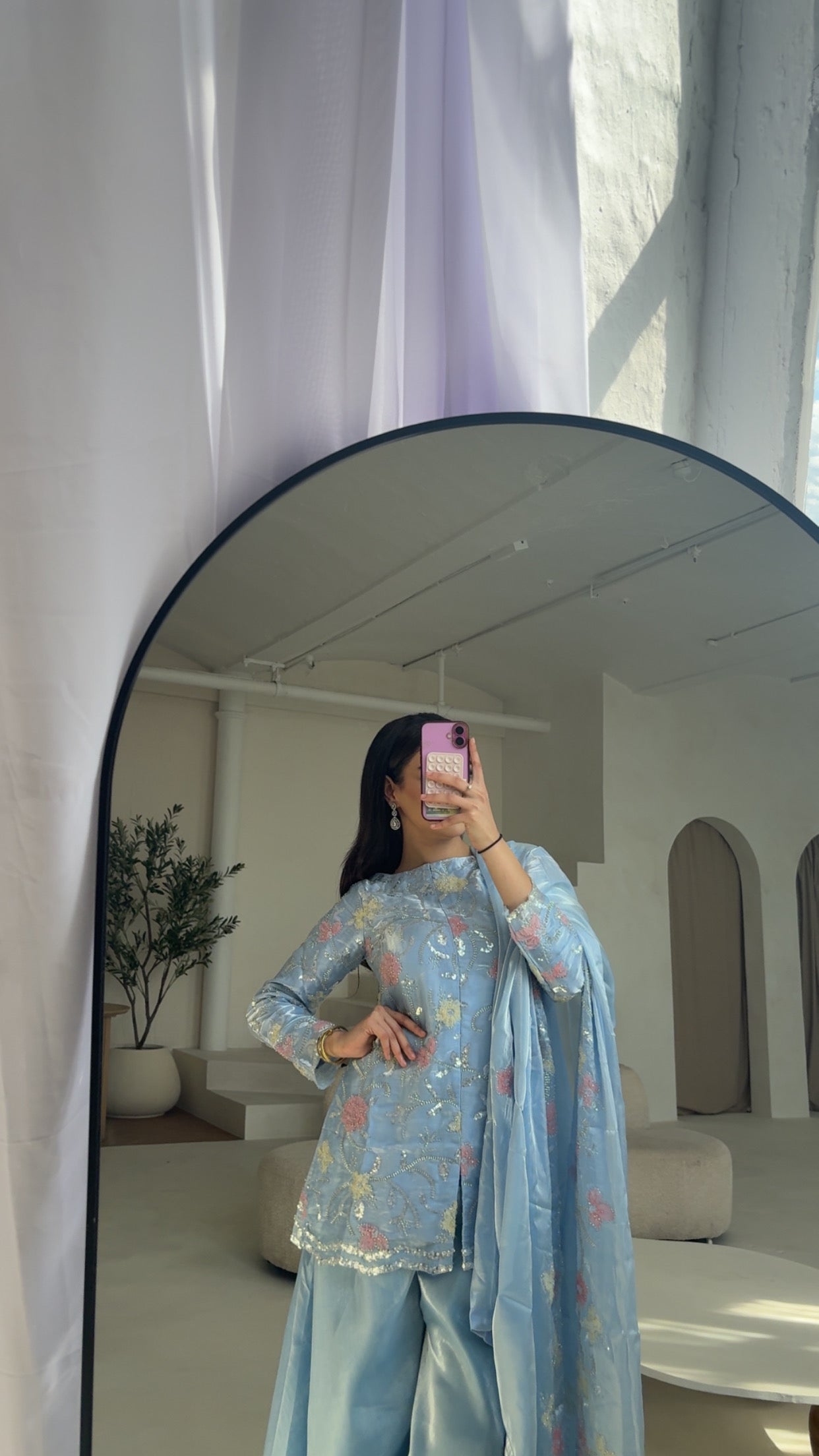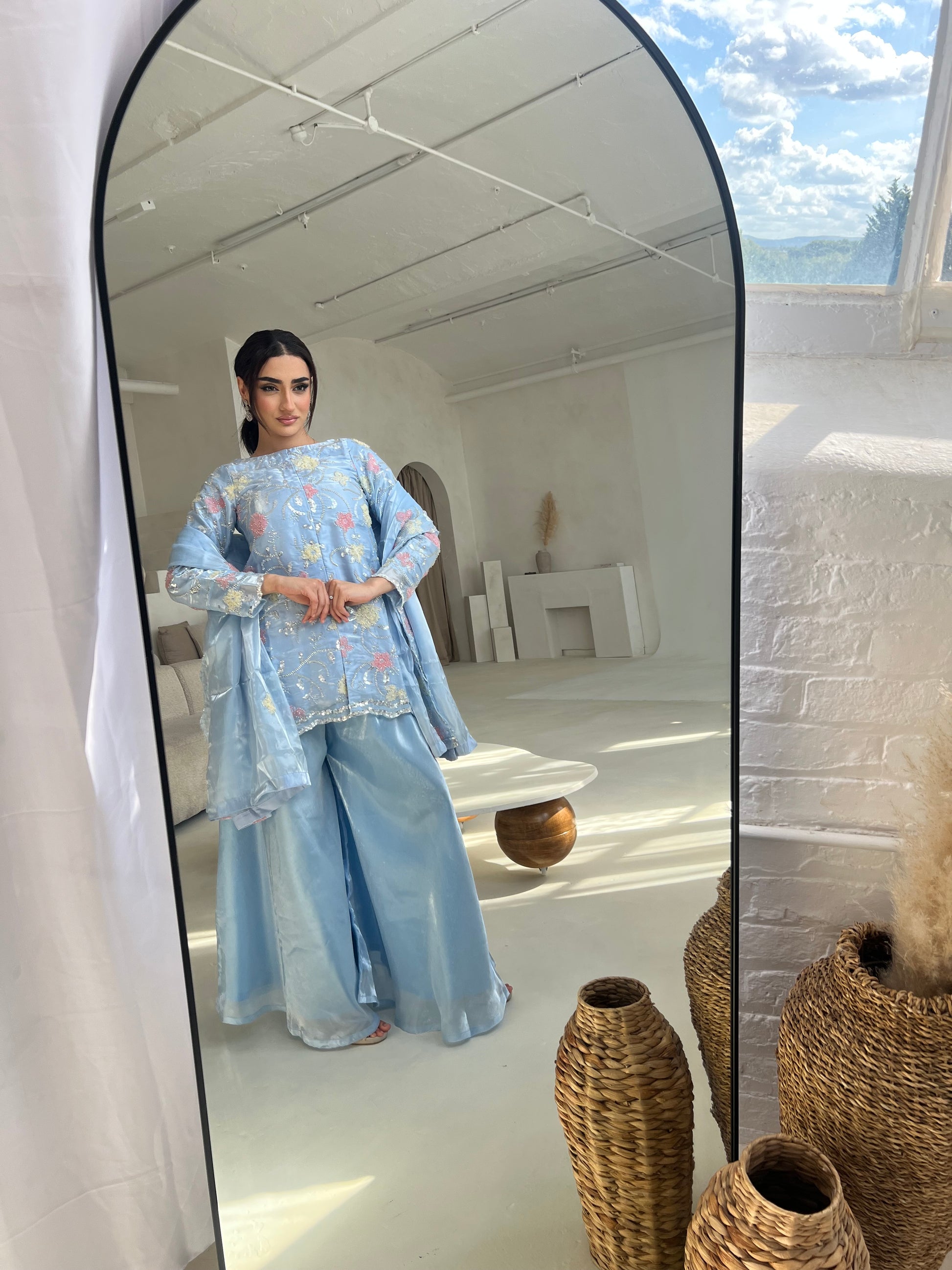 This pastel Pakistani silk suit, adorned with delicate floral detailing comes with a garara, a heavily embellished dupatta, and a matching Potli bag (4pc) perfect for your formal events.