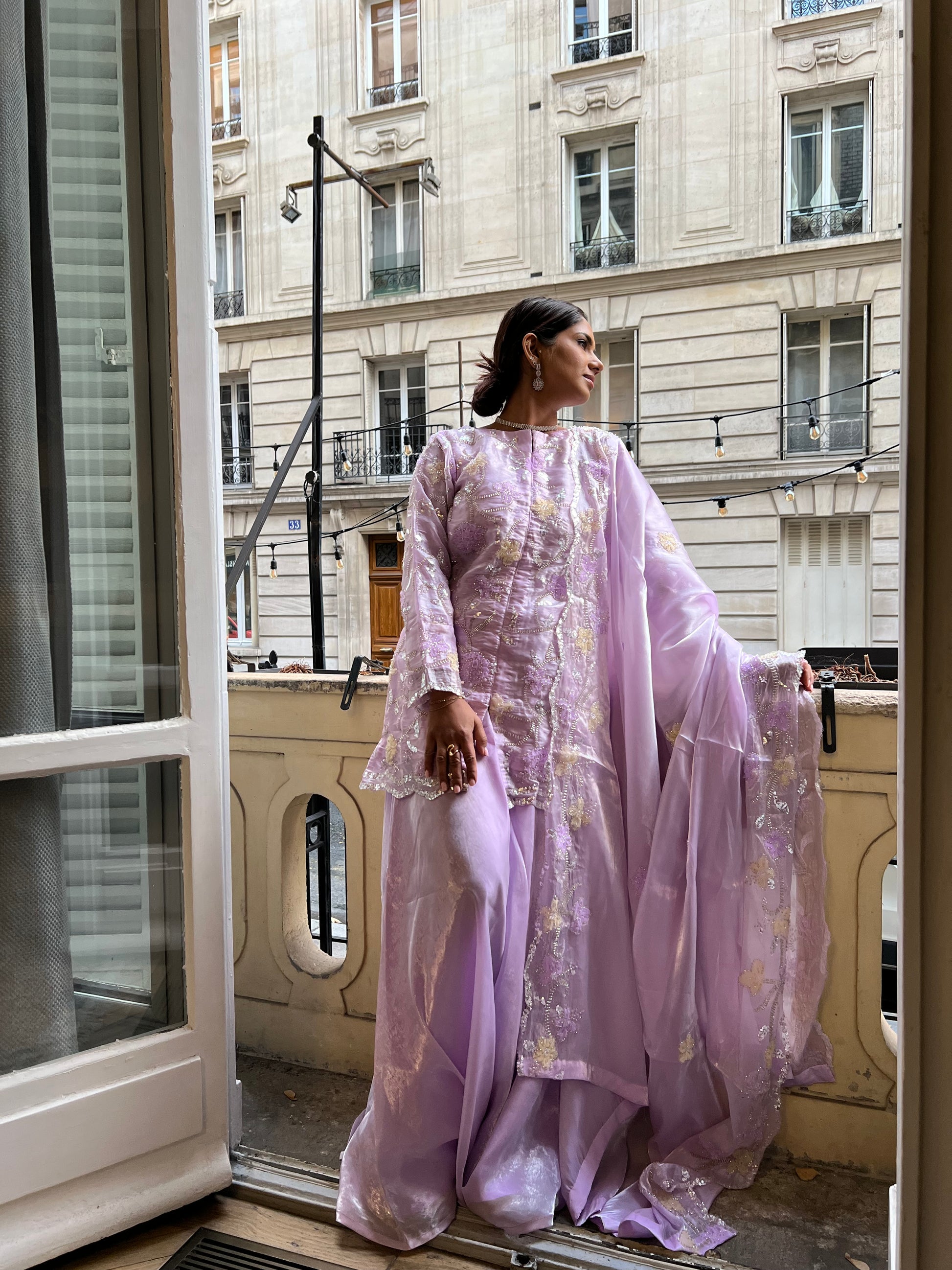 This pastel Pakistani silk suit, adorned with delicate floral detailing comes with a garara, a heavily embellished dupatta, and a matching Potli bag (4pc) perfect for your formal events.