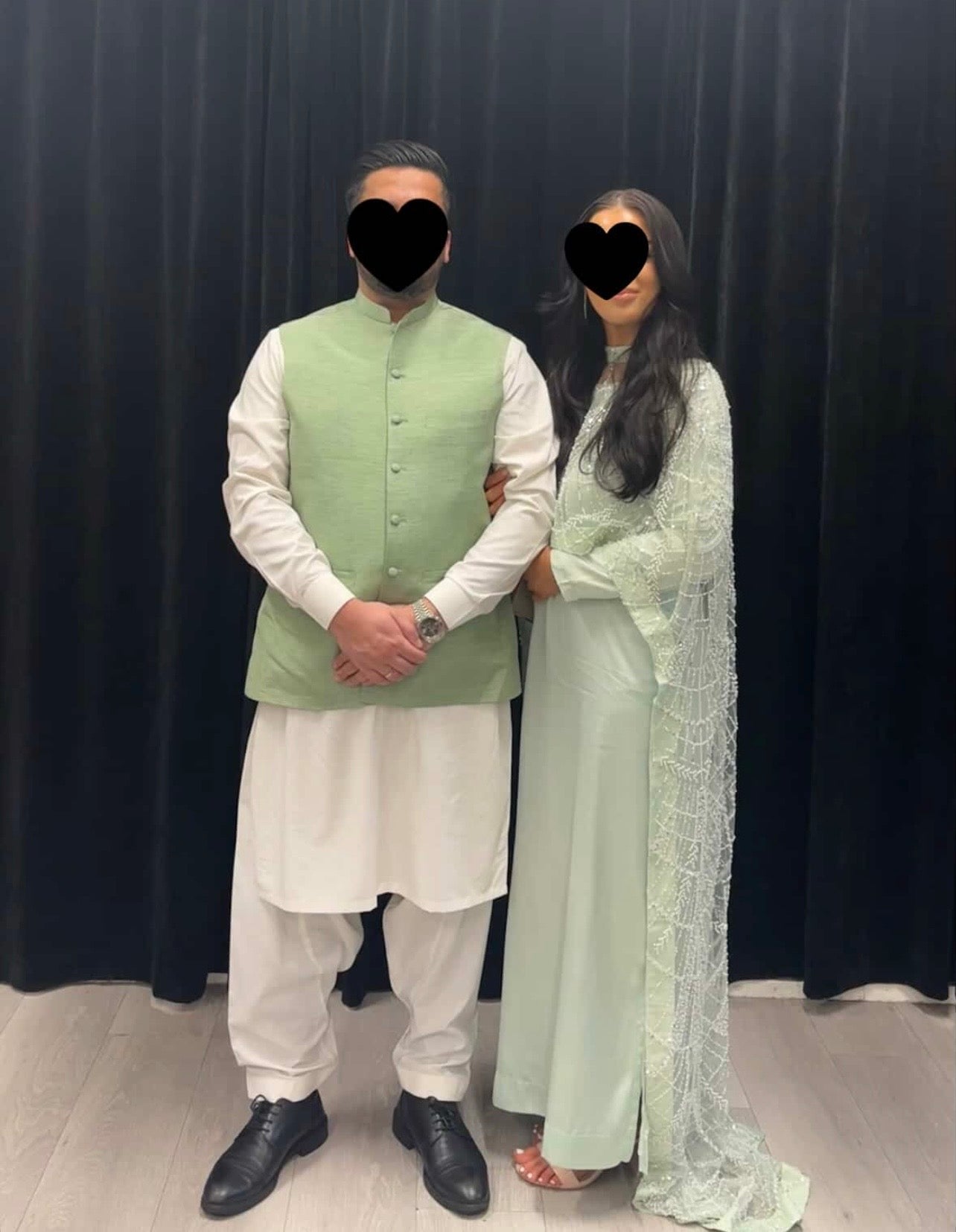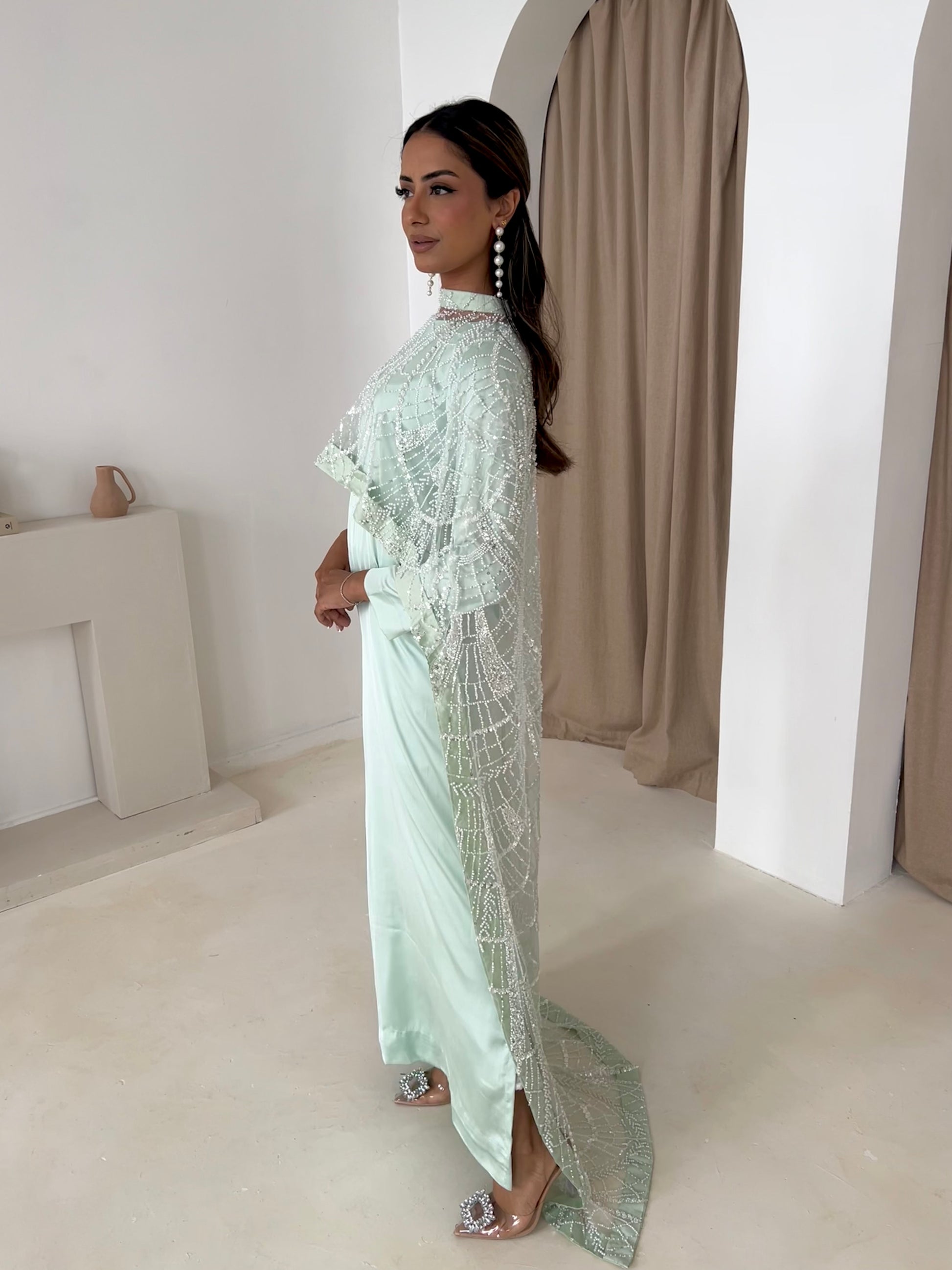 Make an entrance in the Dina Mint Embellished Trail Cape. Crafted on delicate net with hand-placed beads and cutdana, this 2-piece set includes a modest satin-silk slip dress for effortless coverage. A statement silhouette for weddings, Eid and evening events. UK delivery available.