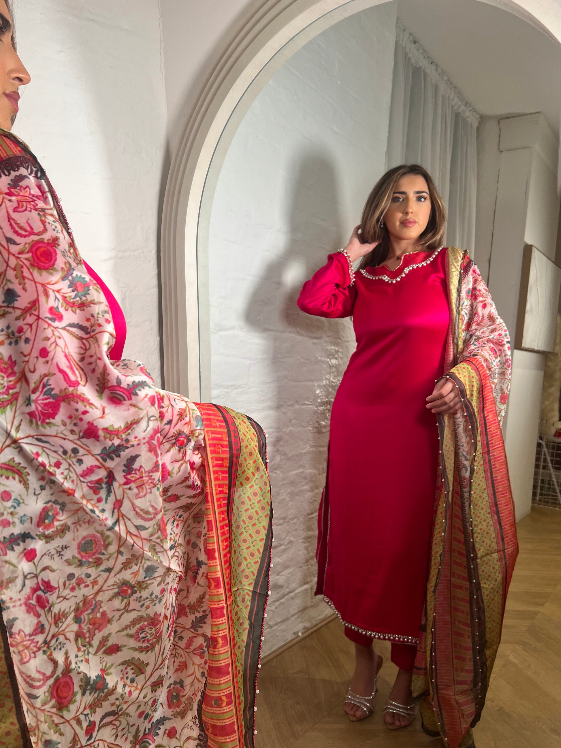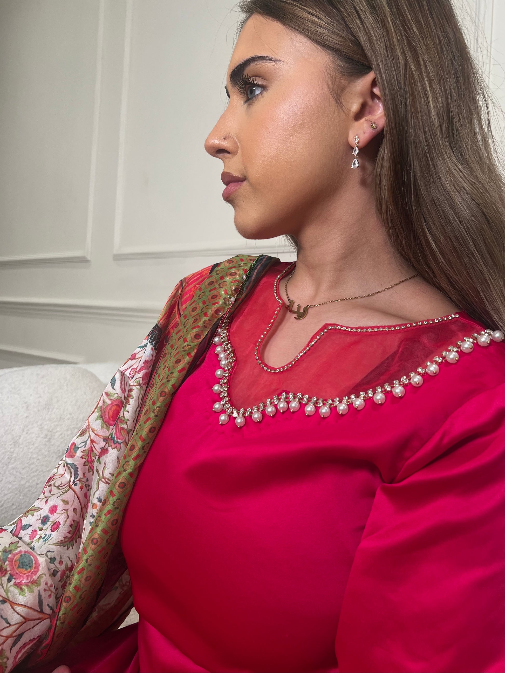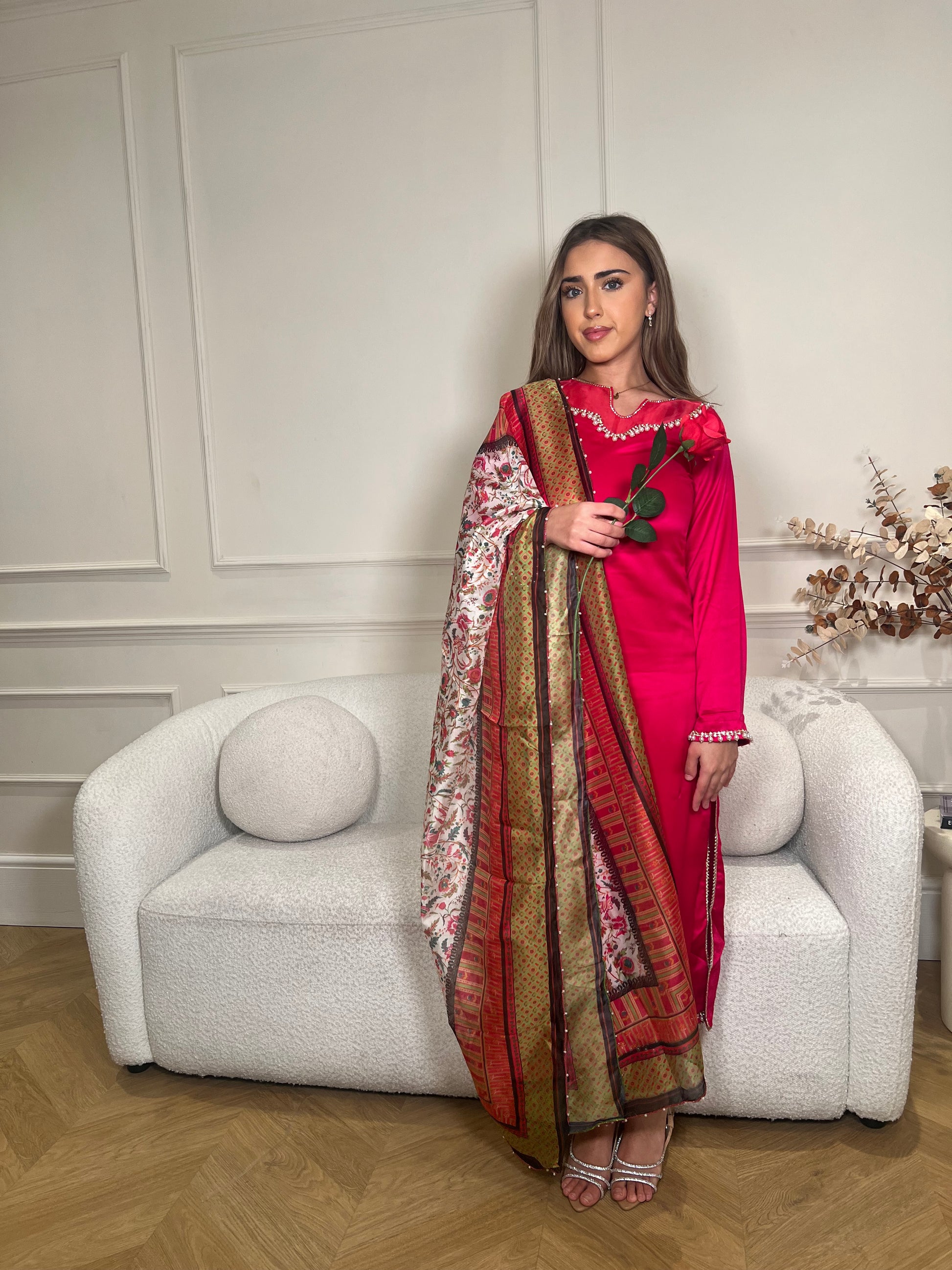 A hot pink three-piece Pakistani suit is indeed a bold and stylish choice. The vibrant color makes it perfect for making a statement at any event. The intricate stone and pearl work adds a touch of elegance and luxury, while the organza detailing provides a delicate, ethereal finish. This combination of elements ensures that the suit is both eye-catching and sophisticated, making it ideal for weddings, festive occasions, or formal gatherings.