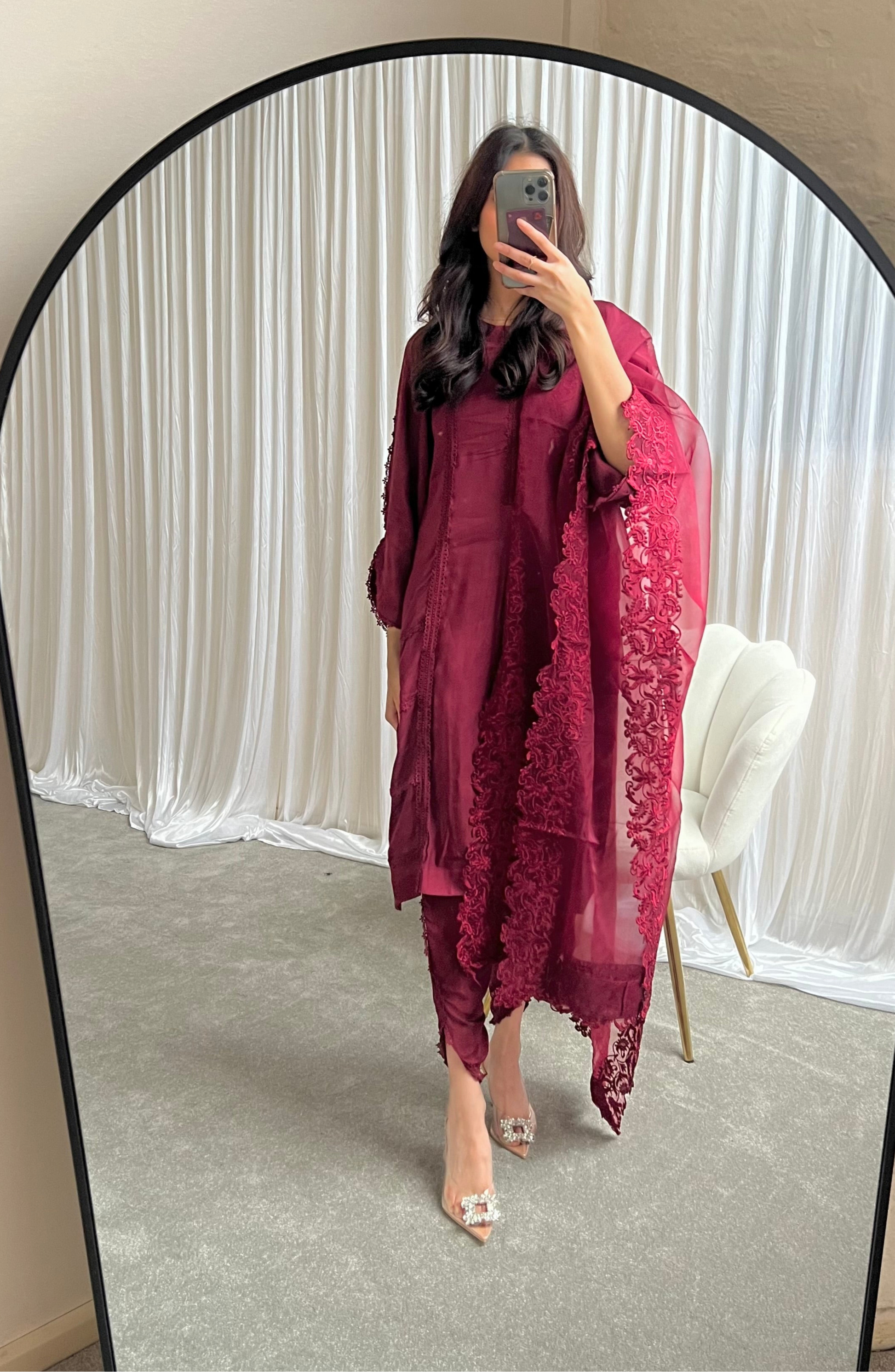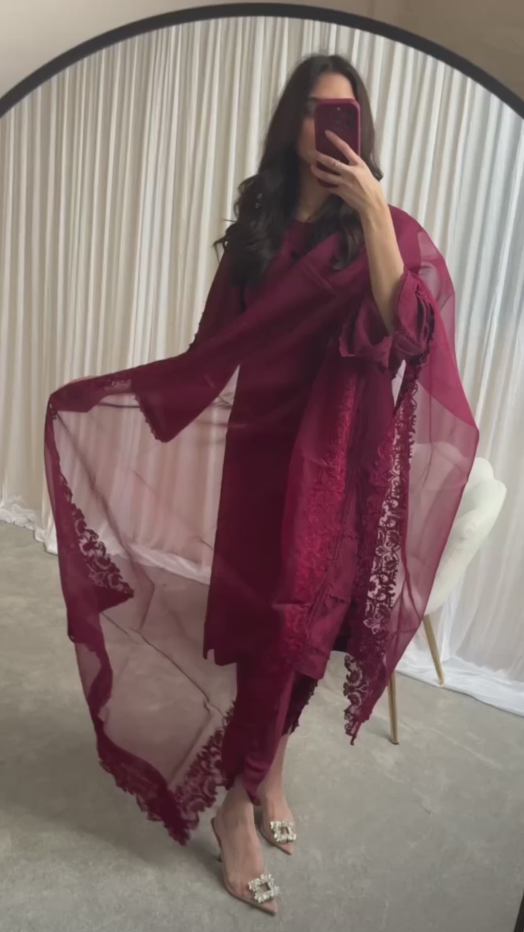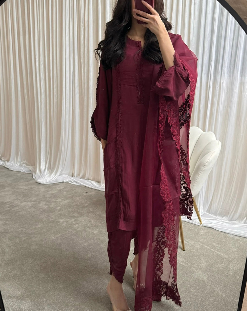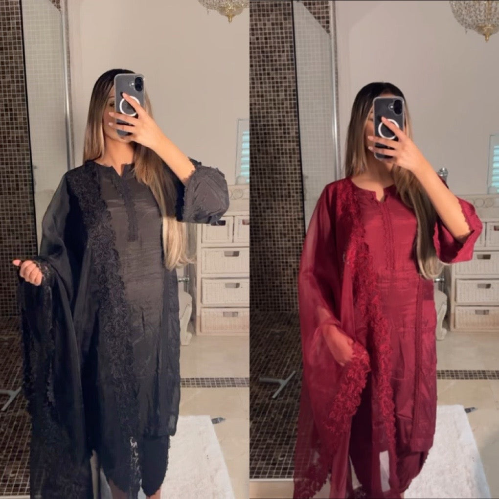 Elevate your wardrobe with this exquisite burgundy 3piece Pakistani suit, crafted for those who appreciate elegance and timeless style.