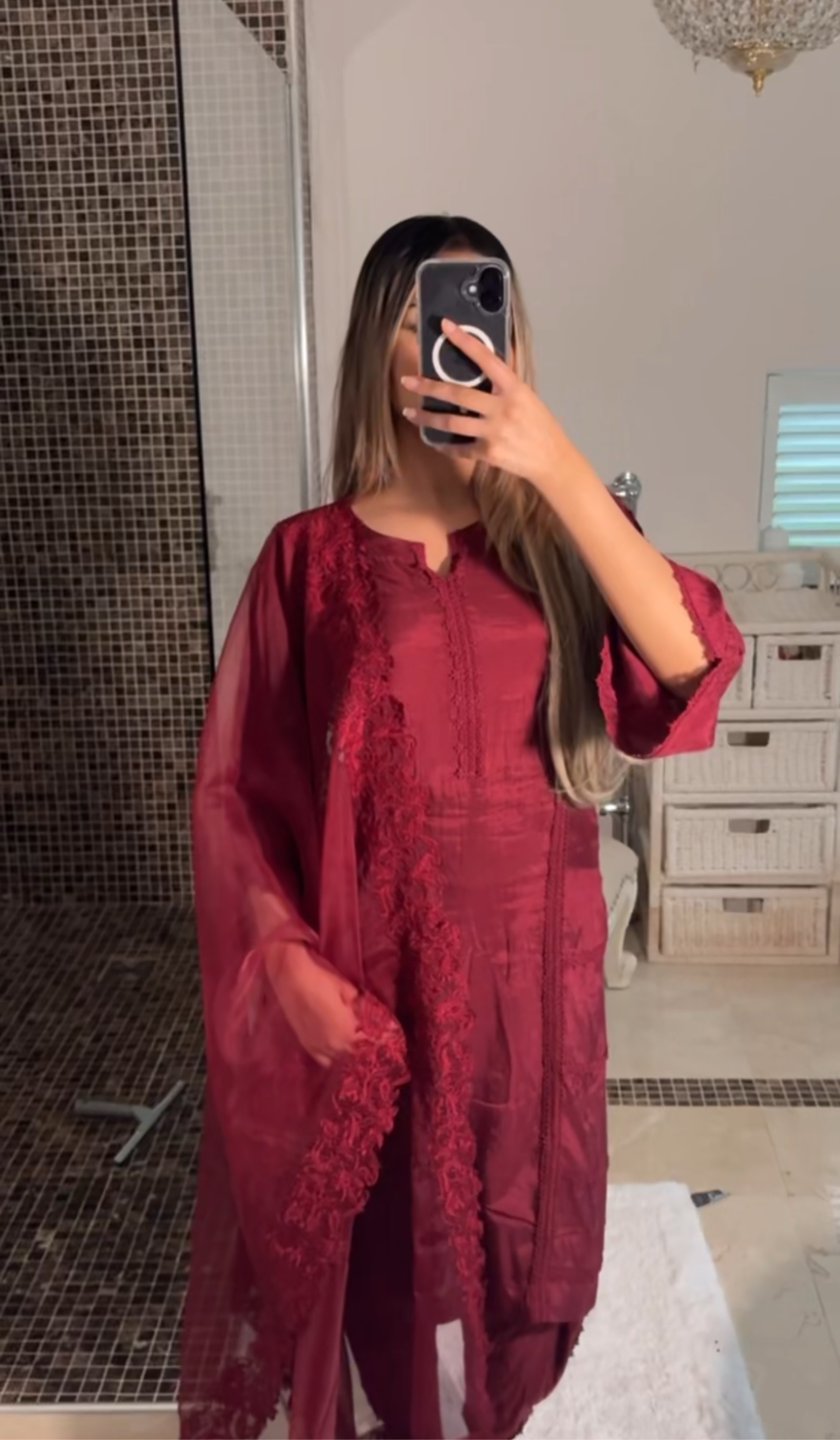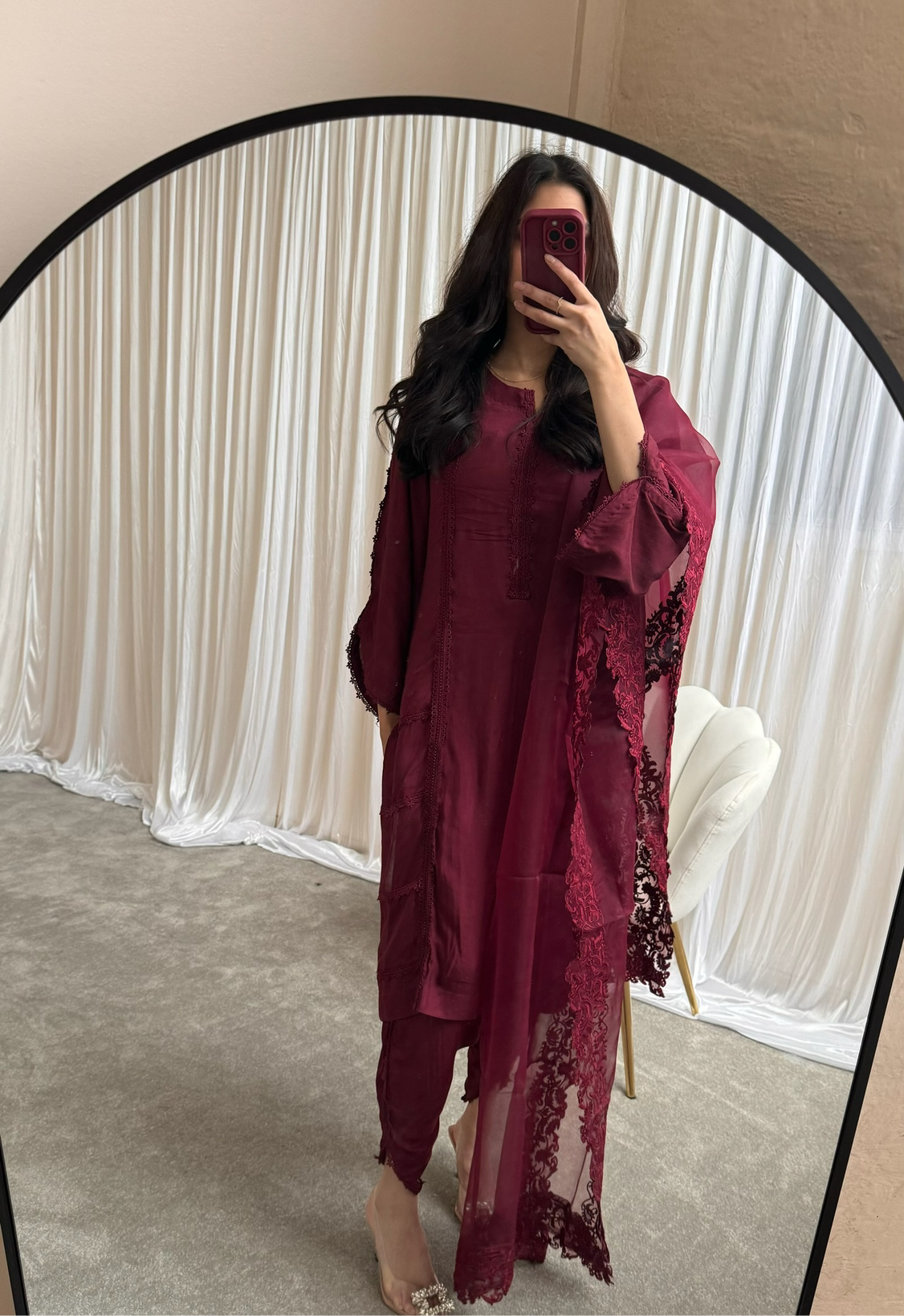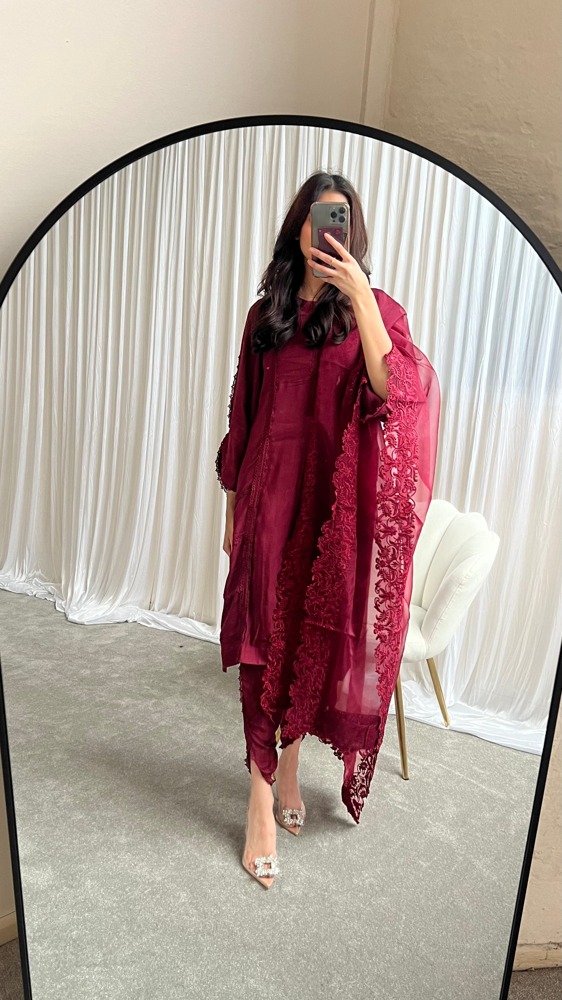 Elevate your wardrobe with this exquisite burgundy 3piece Pakistani suit, crafted for those who appreciate elegance and timeless style.