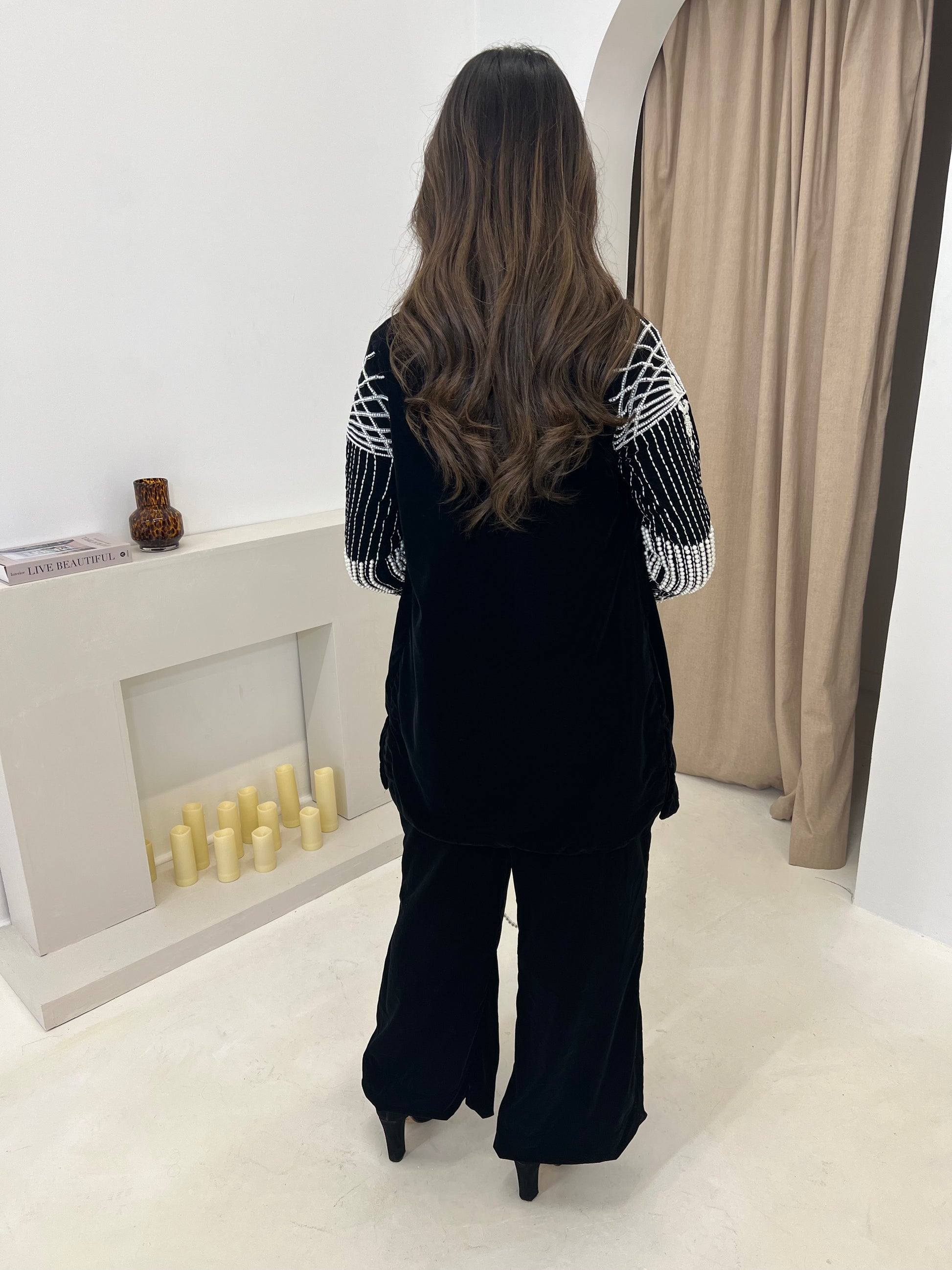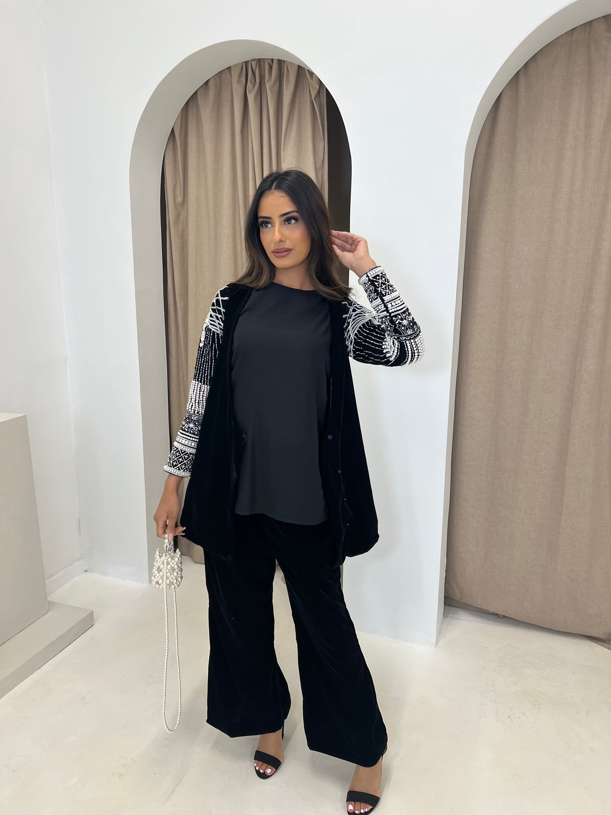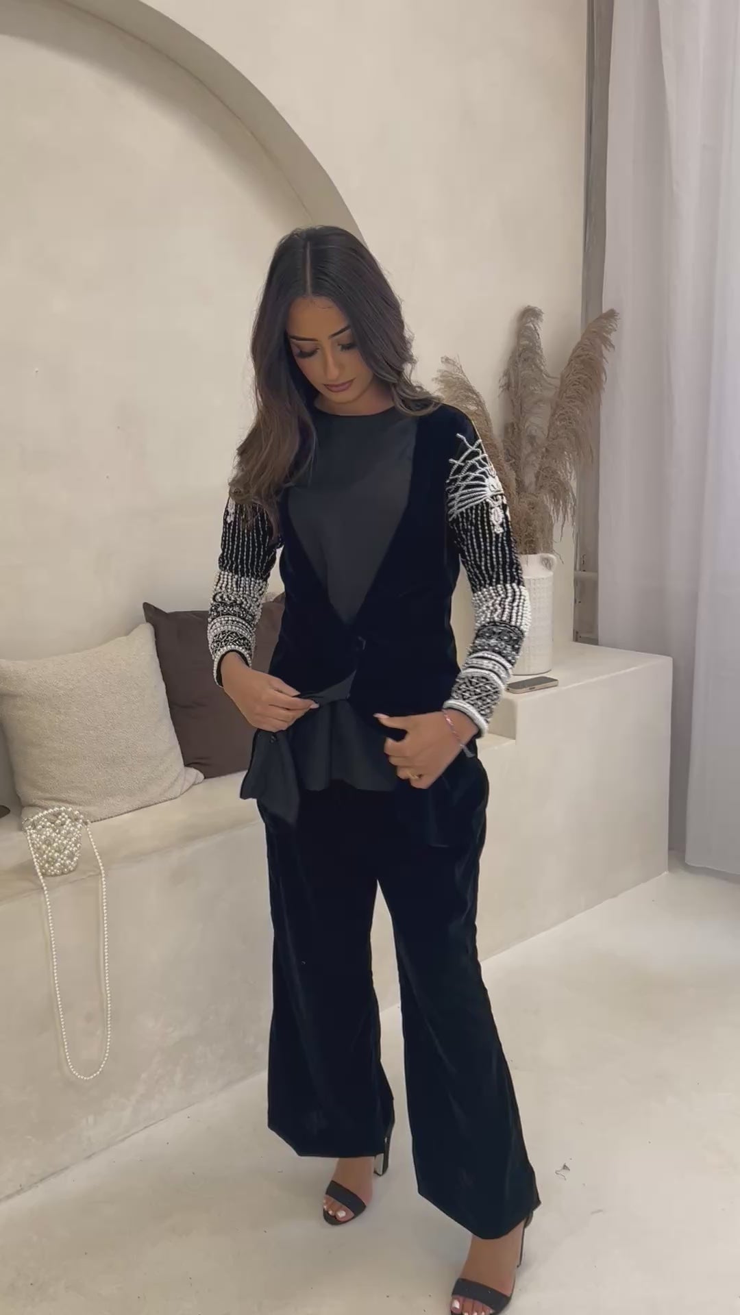 Elevate your wardrobe with our luxurious 3-piece embellished velvet blazer set. Featuring intricate detailing and versatile buttons, style it closed for a polished look or open for effortless elegance. Perfect for every occasion.