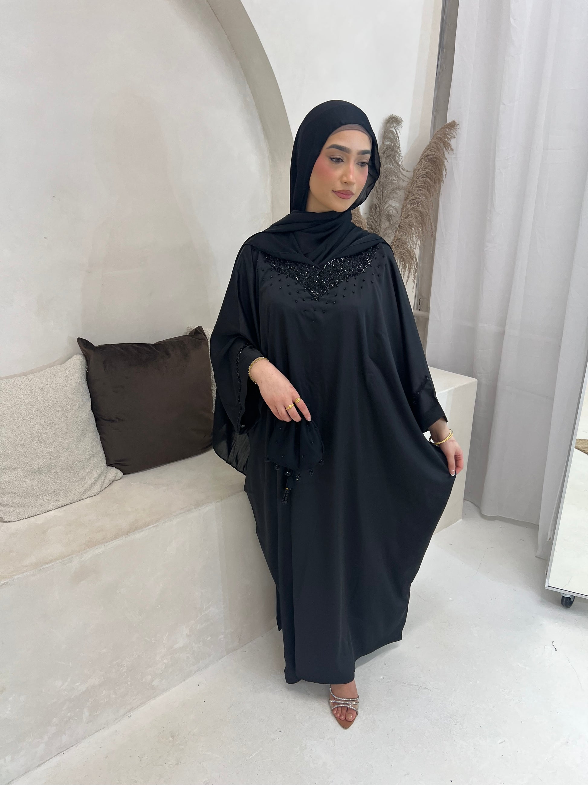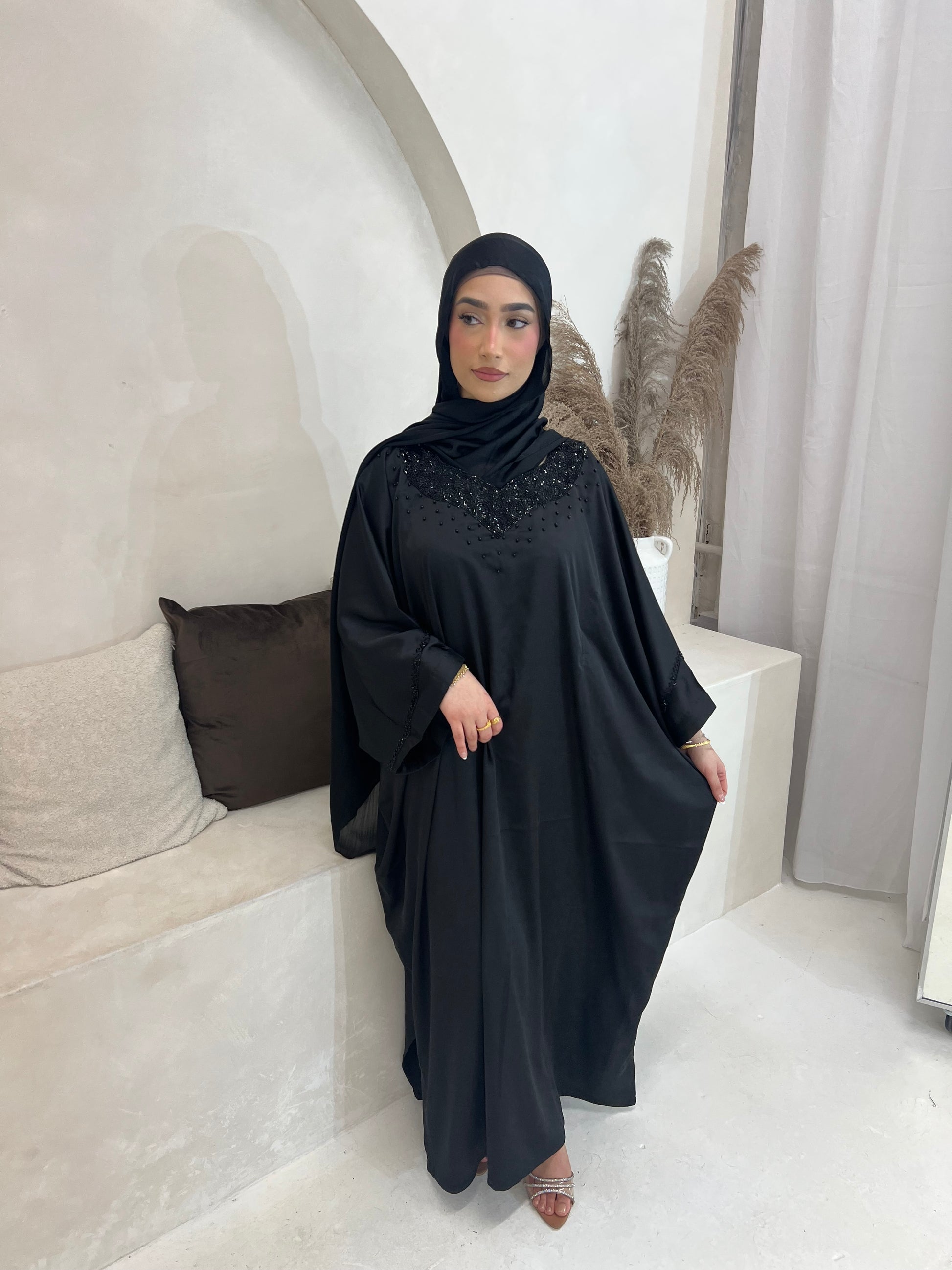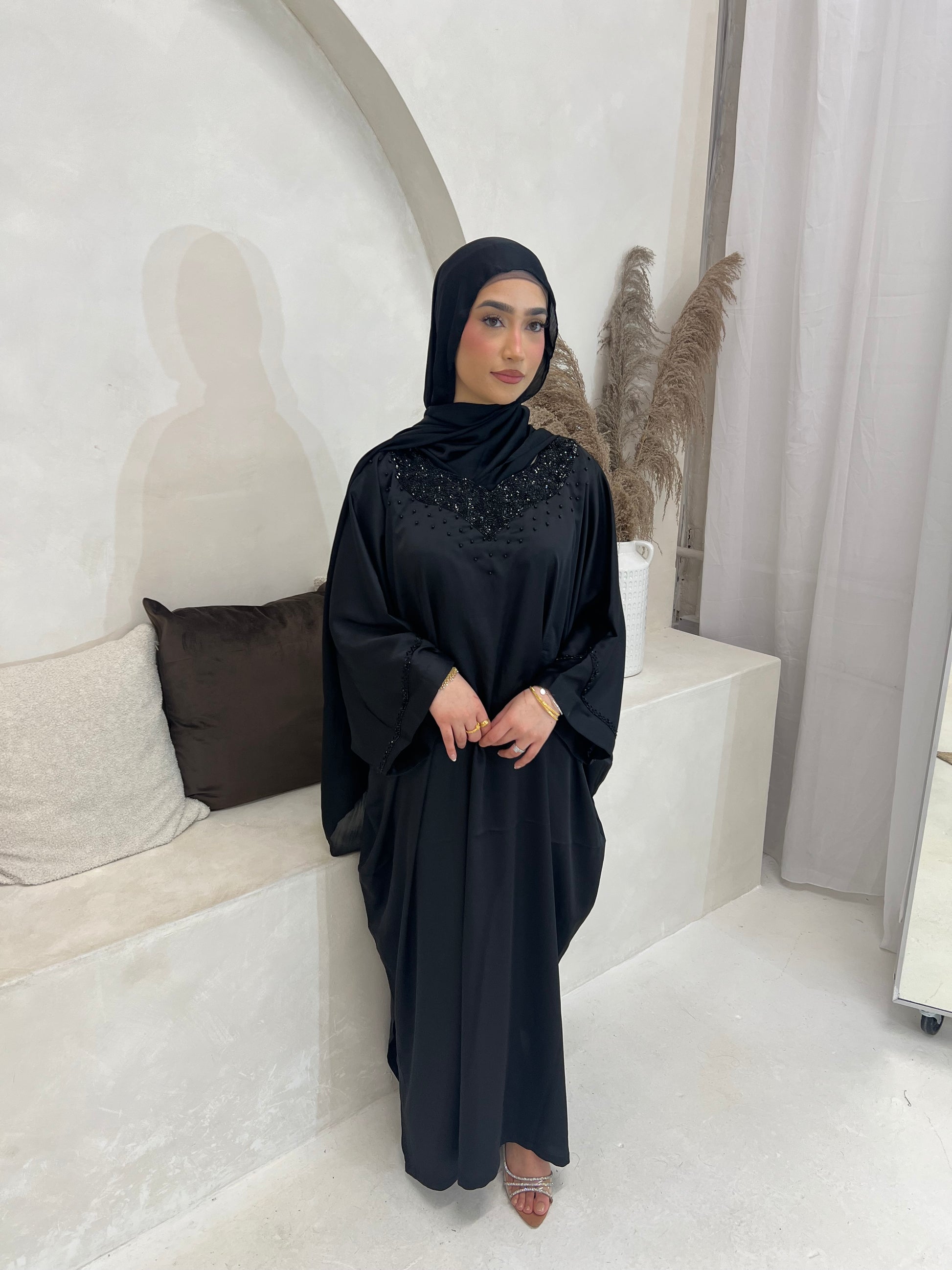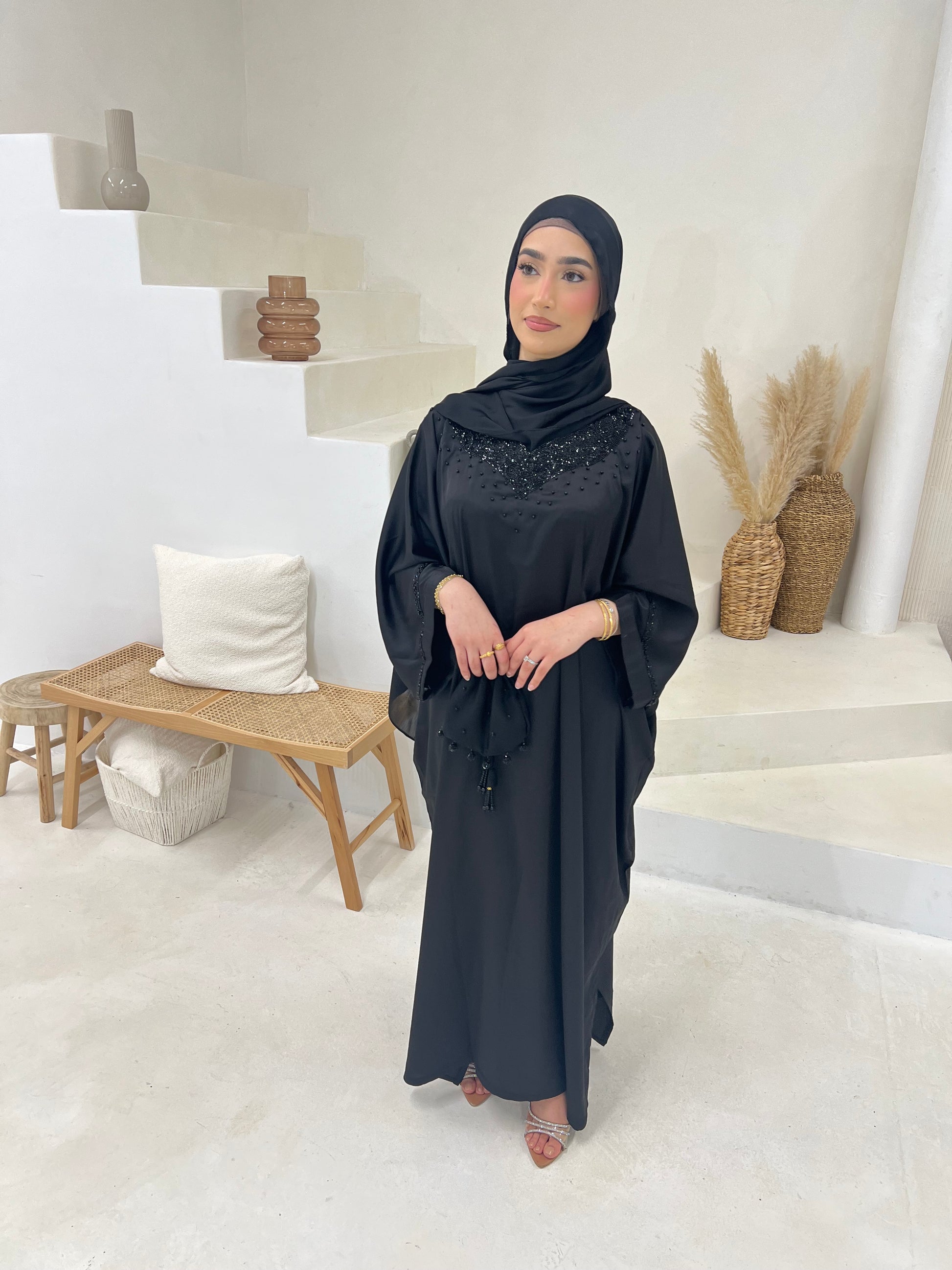 This collection includes a stunning cutdana kaftan with exquisite pearl work detailing on the neckline, made from luxurious Nidha fabric.