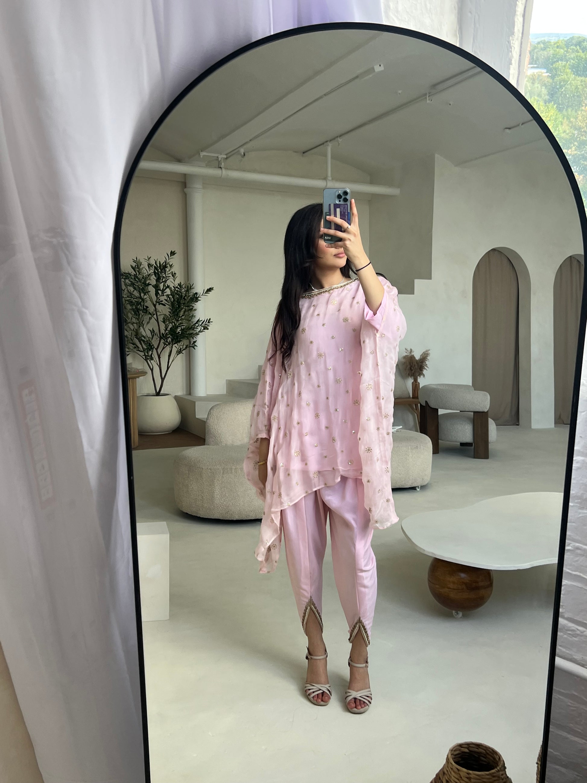 Paired with tulip pants in soft raw silk for a modern silhouette.