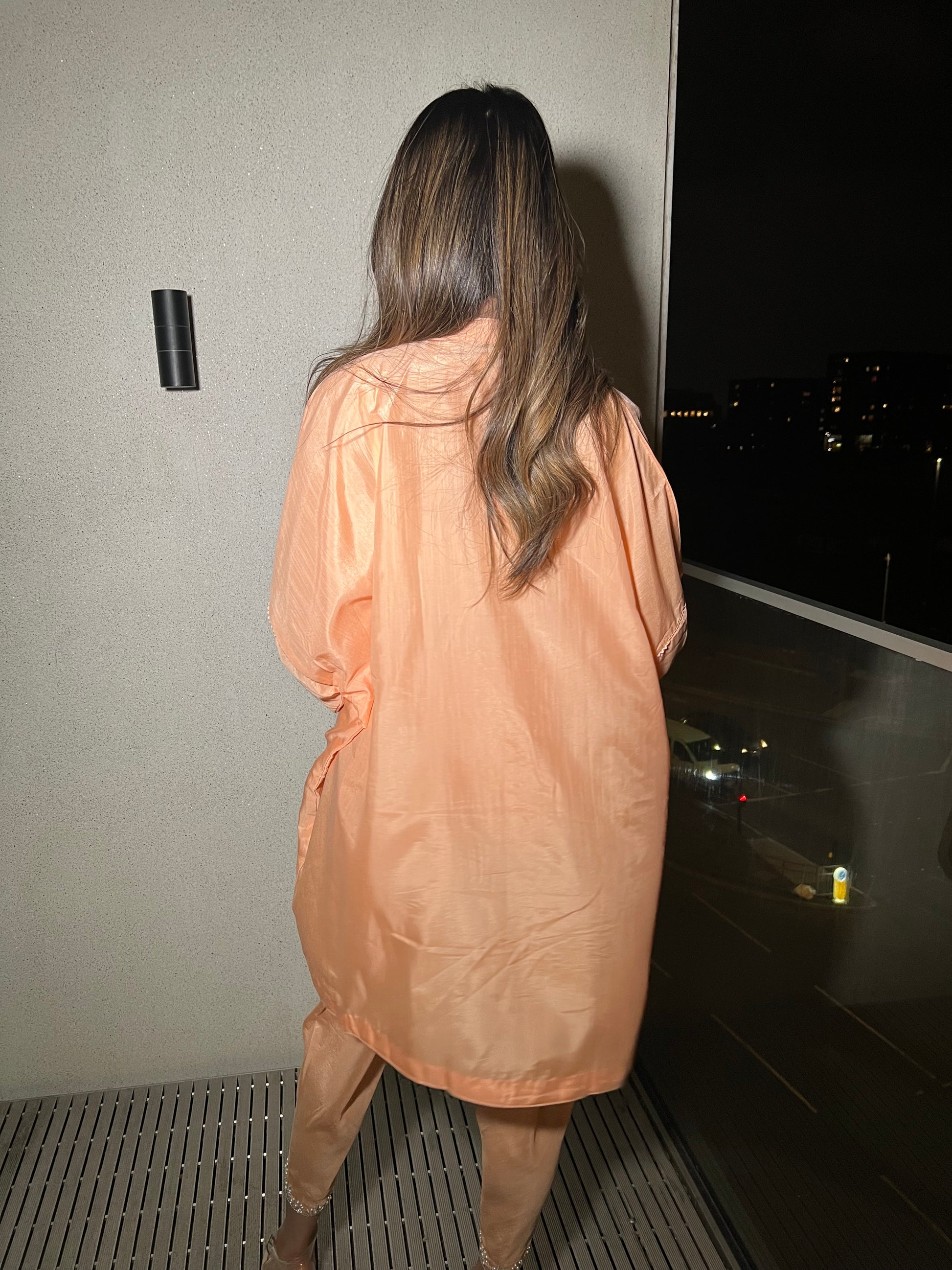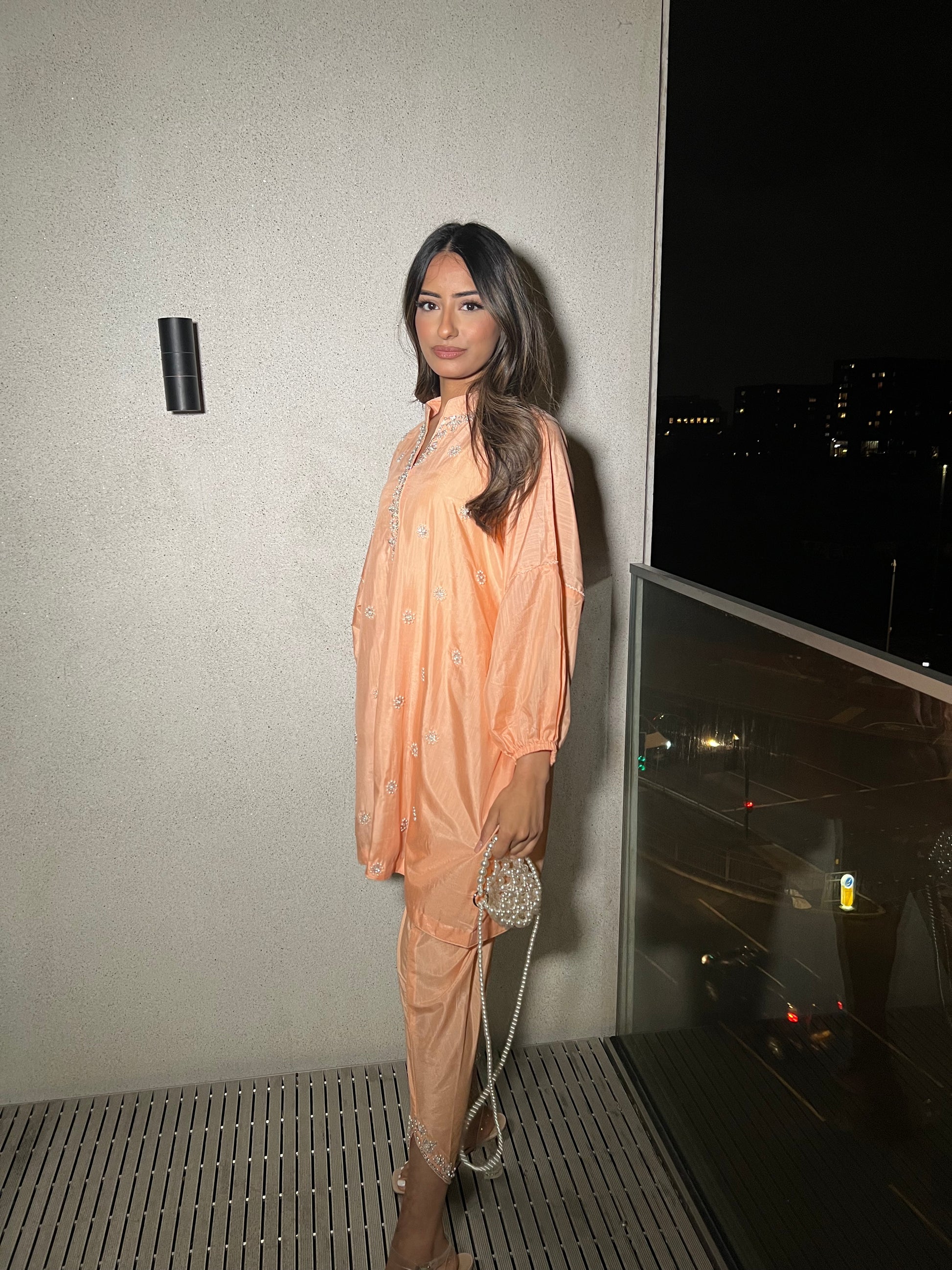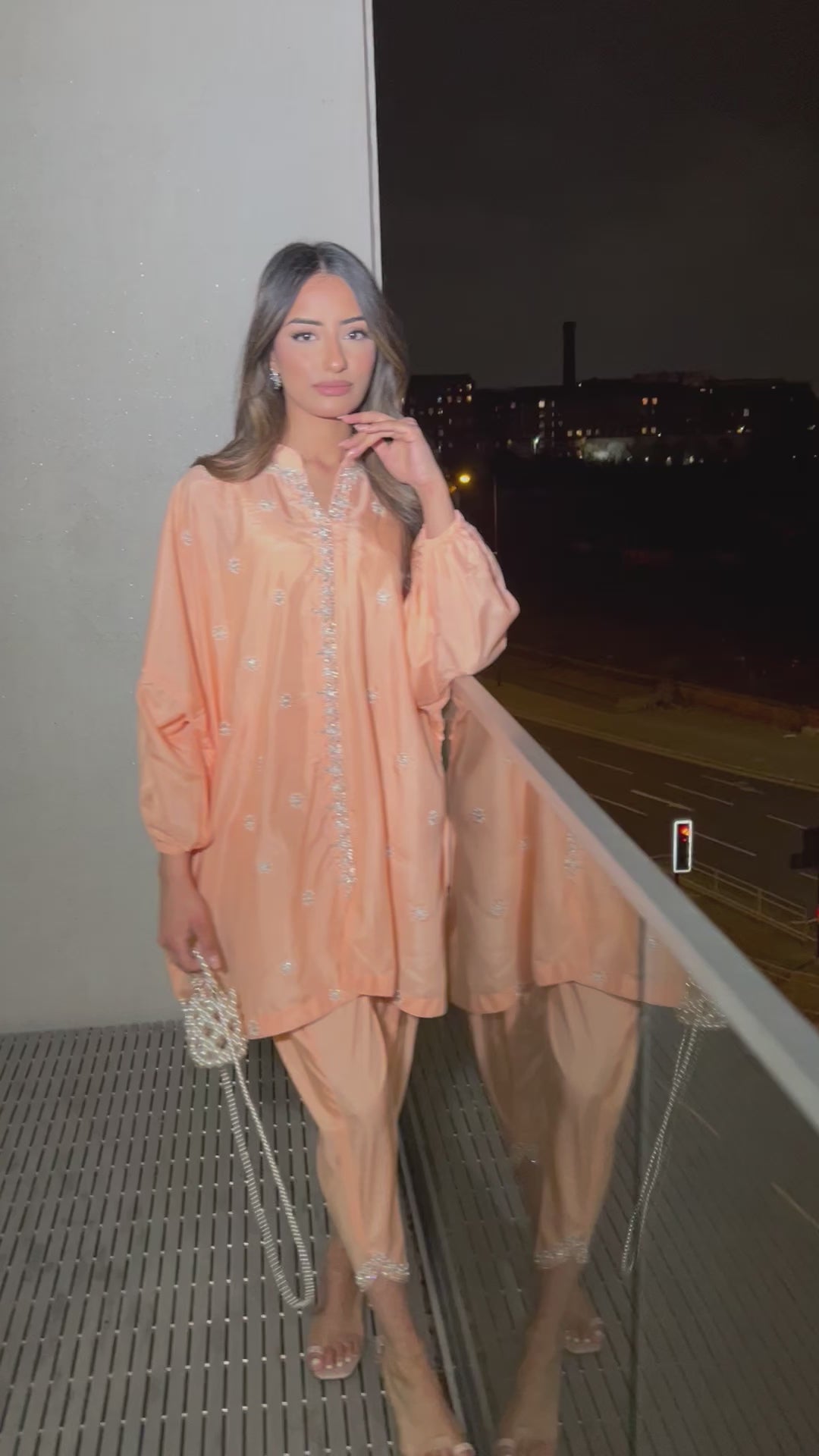 This contemporary two-piece set boasts exquisite Pakistani handwork for an opulent, regal look. It's a luxurious piece that brings a touch of royalty to your wardrobe, designed to last for years to come.