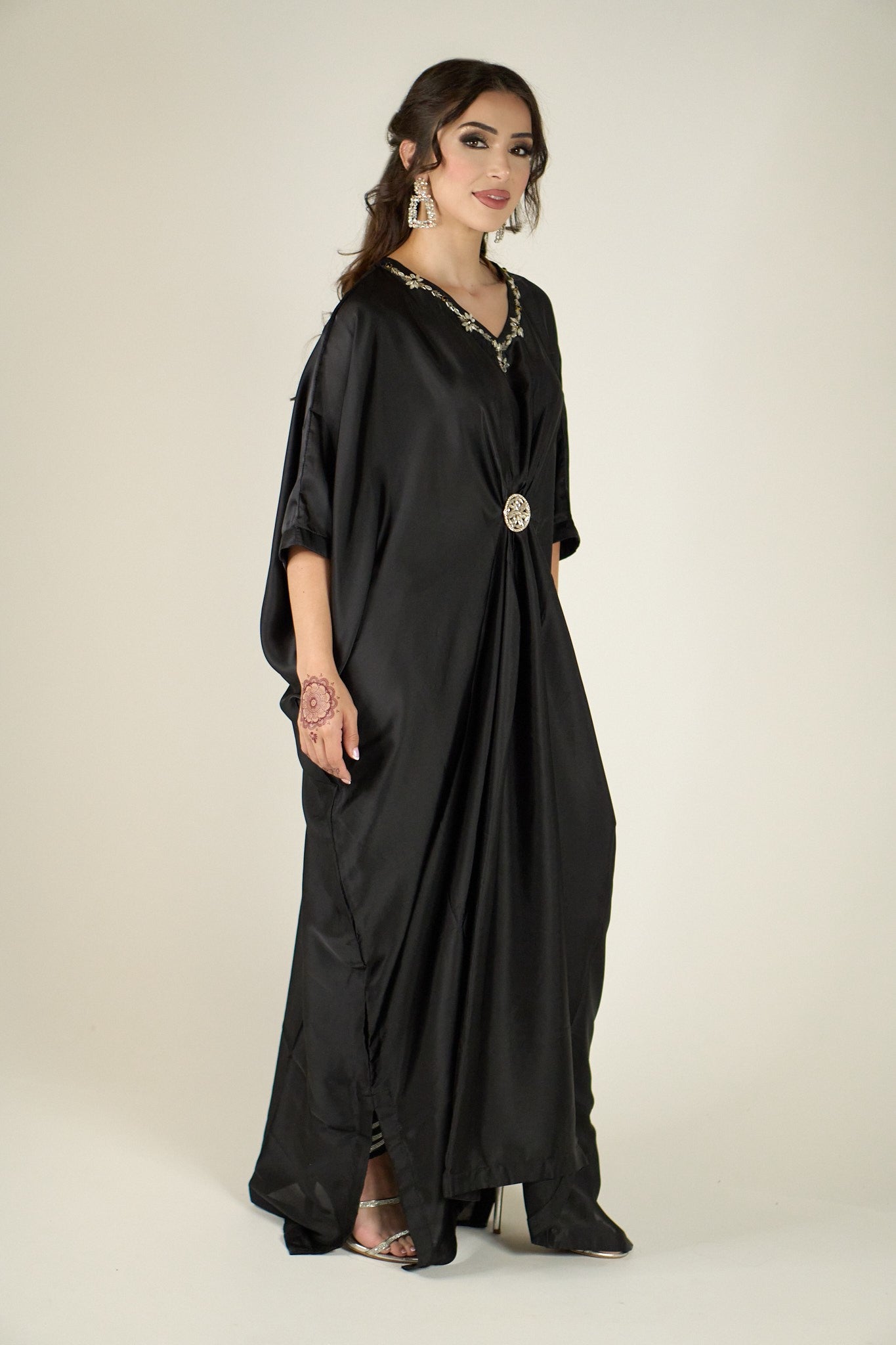 Adorn Yourself in the Exquisite Beauty of our Modest Kaftan, enhanced with Authentic Pakistani Embroidery.
